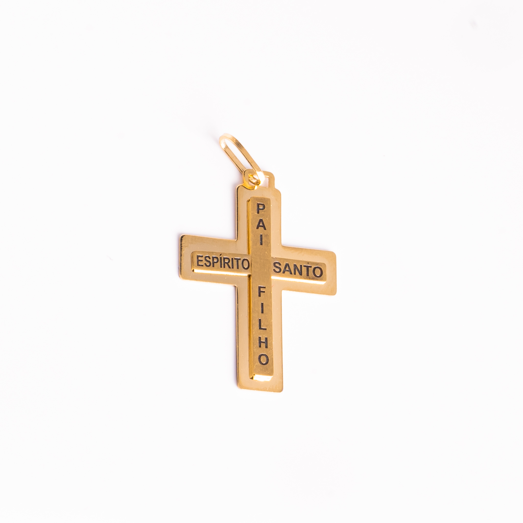 Um pingente de cruz em ouro amarelo 18 quilates com uma inscrição significativa que diz “Pai, Filho e Espírito Santo”. Este pingente é uma representação religiosa profunda e é confeccionado em ouro de alta qualidade, proporcionando durabilidade e brilho duradouro. É uma peça de joalheria que combina elegância e espiritualidade, perfeita para quem deseja carregar sua fé de forma discreta e significativa. É um lembrete constante da presença divina e da trindade cristã.